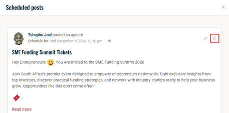 To delete the post, click the delete icon next to it.